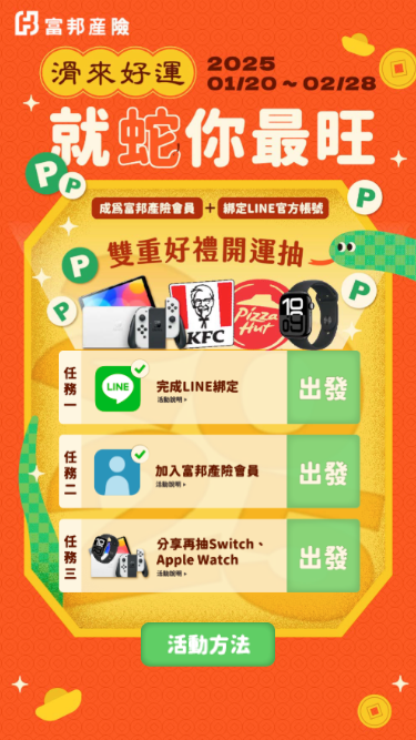 富邦產險|滑來好運,就蛇你最旺|成為富邦產險會員+綁定LINE官方帳號 雙重好禮開運抽