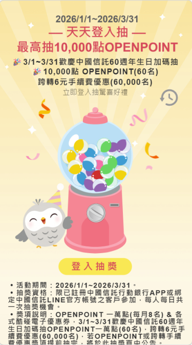 中國信託 | 天天登入抽 歡慶生日 ! 加碼60名,萬點OPENPOINT免費抽