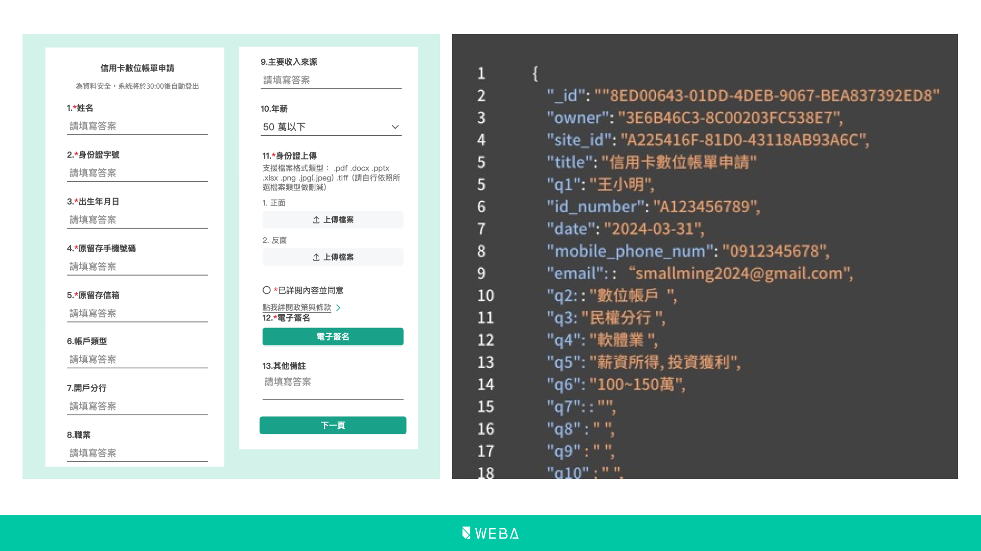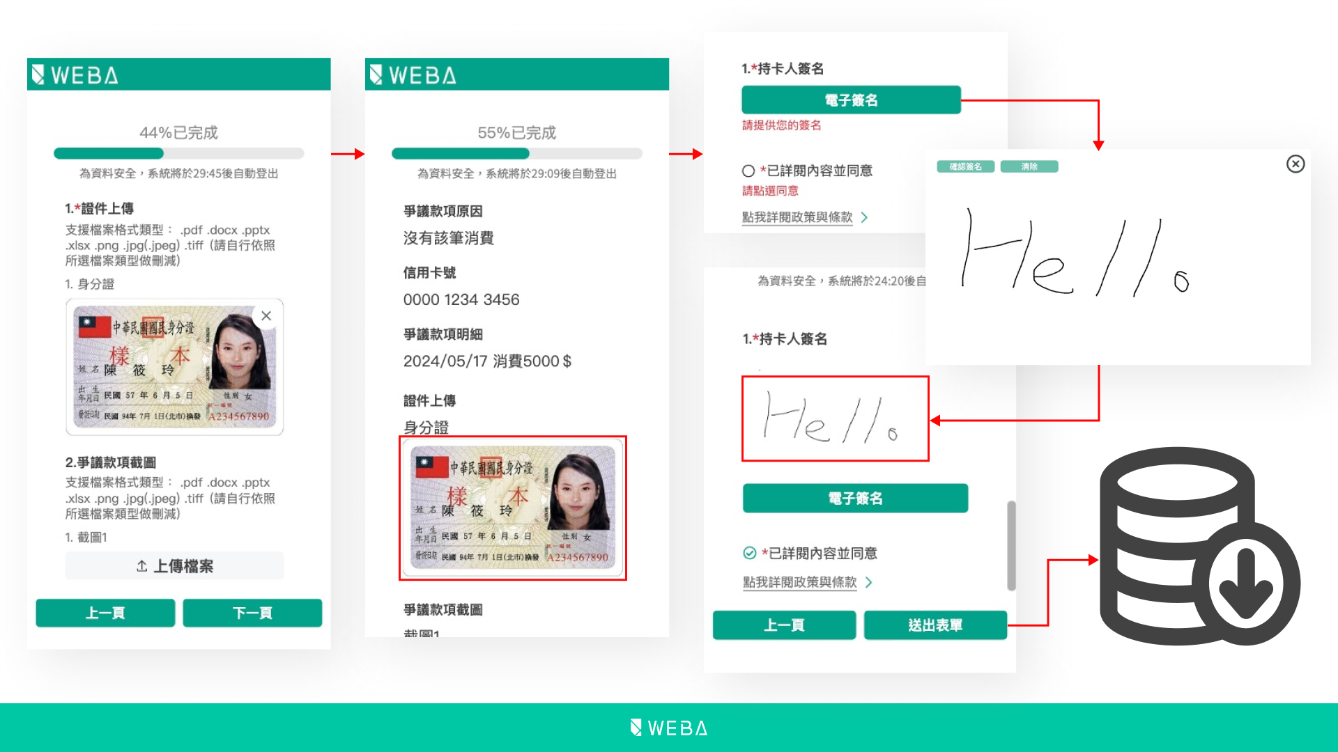 當然,仍有部分資料是需要客戶自行填寫的,例如:需另外上傳的證明文件、客戶簽名…等。這些資料同樣可透過 API 回傳至企業內部系統,且同時備份在 WEBA 後台可進行複查。