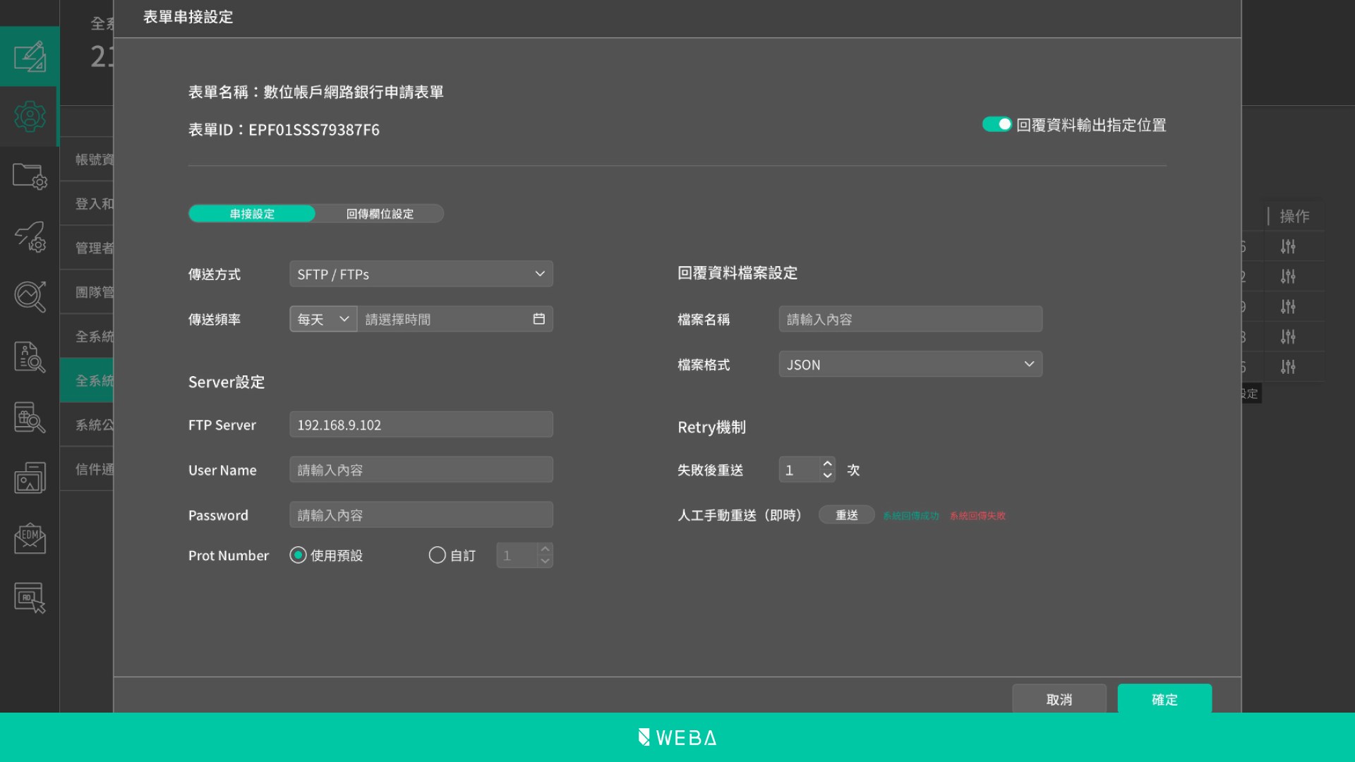 另外,技術人員更可以在 WEBA 上自訂動態 API 的:存取方式、傳送位置、傳送欄位、傳送頻率、Retry 機制…等設定,讓無紙化拋接資料的建置工作更簡單快速。