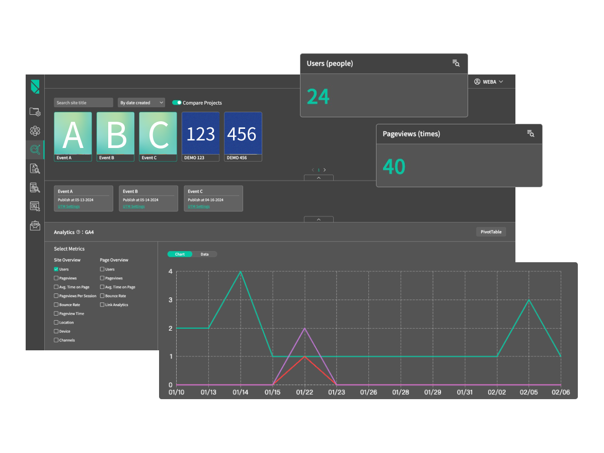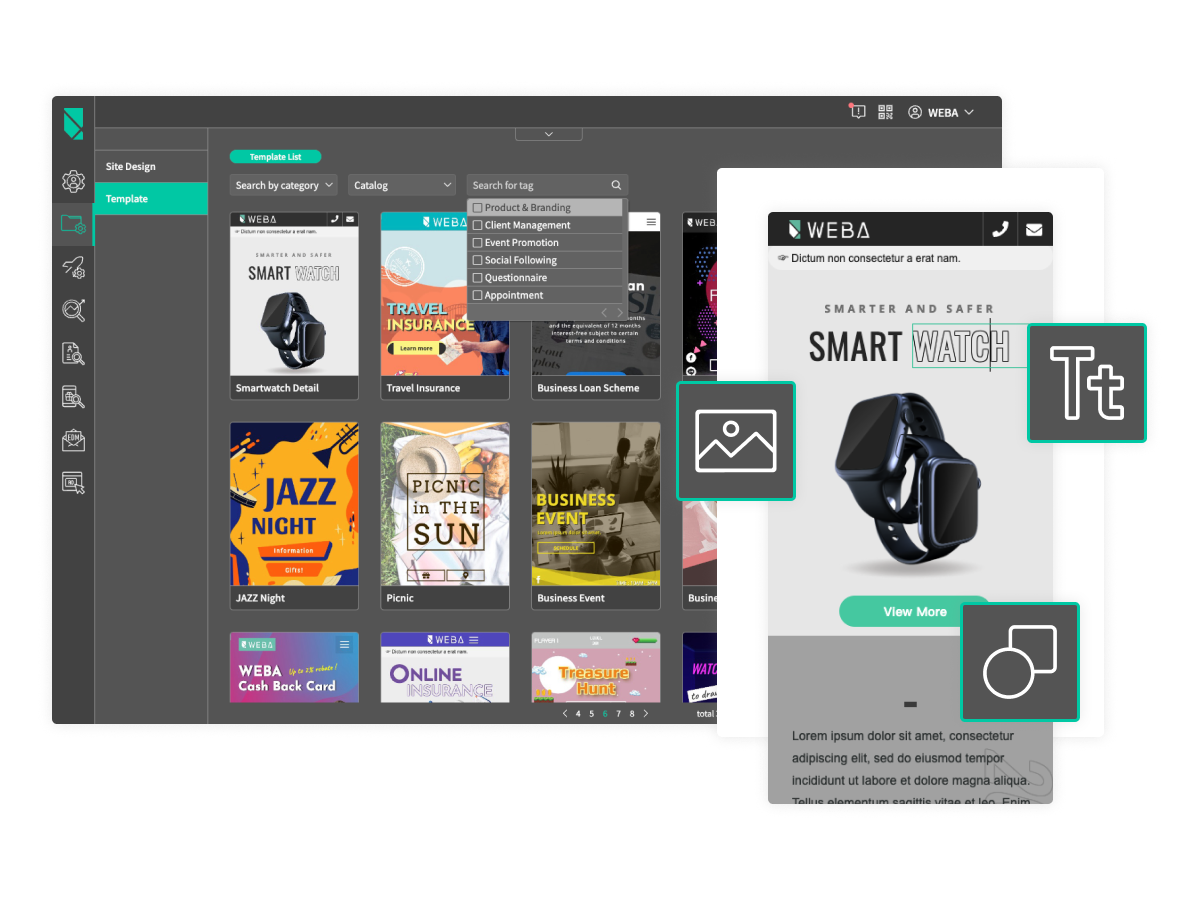 WEBA 數位互動平台是一套結合 Martech 與 Fintech 應用的企業級軟體。我們賦予企業無需程式碼,就能以模組化功能組合出銷售及服務流程中所需的網頁解決方案。並可因應需求提供落地安裝、私有雲建置等導入方式。