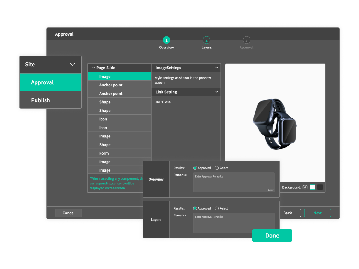 擁 4 項「圖形編輯」相關之專利,可在畫布中自由拖拉點選元件、調整頁面長度,架設一頁或多頁式的網頁。